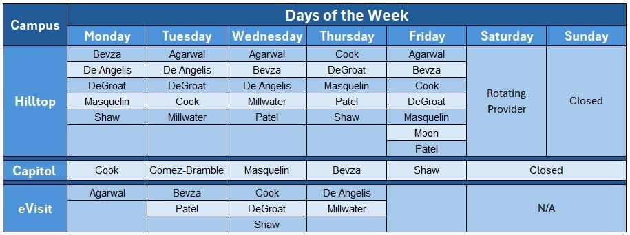 Below is the usual weekly schedule of our providers. There might be slight variations to this schedule to accommodate vacations and other events.